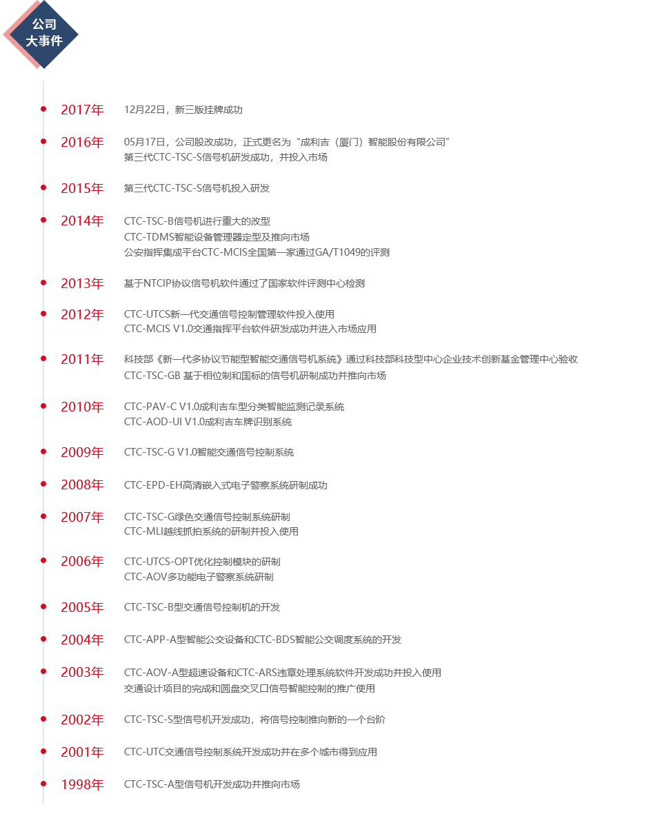 成利吉(廈門)智能股份有限公司,成立于1998年,是國內(nèi)最早從事智能交通領(lǐng)域產(chǎn)品研發(fā)和應(yīng)用、專業(yè)智能交通核心軟件開發(fā)、智能交通系統(tǒng)集成與運(yùn)營服務(wù)的企業(yè)之一。公司于2016年5月正式更名為成利吉(廈門)智能股份有限公司,并于2017年12月22日新三版成功掛牌。